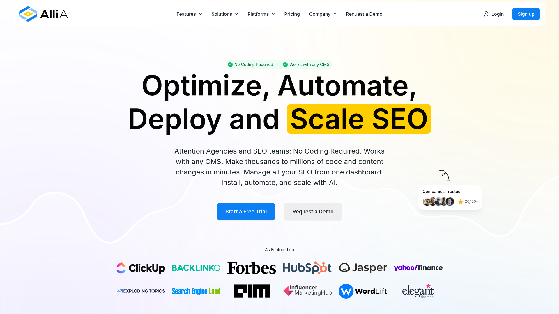 AlliAI omogoča avtomatizacijo SEO optimizacije spletnih strani z uporabo umetne inteligence za izboljšanje uvrstitve in prometa.